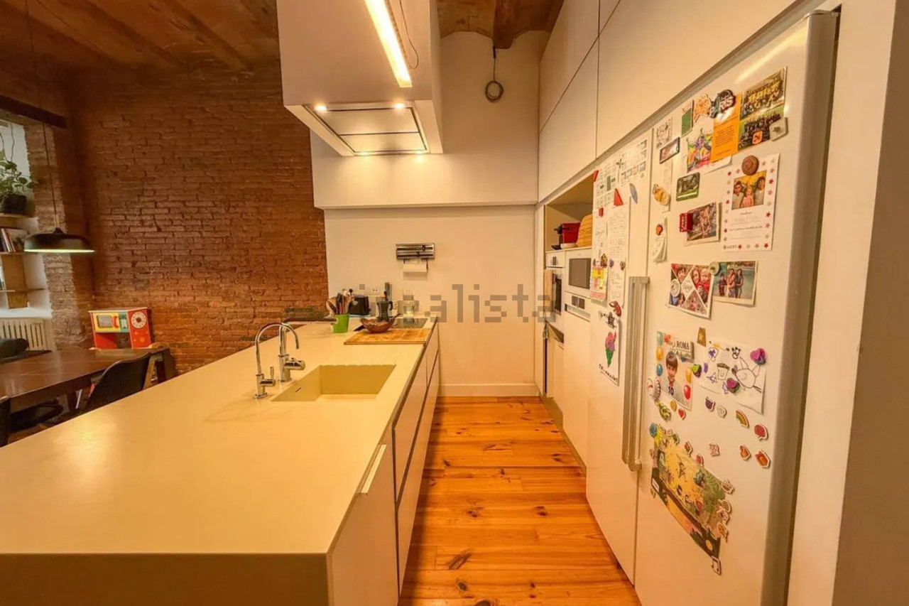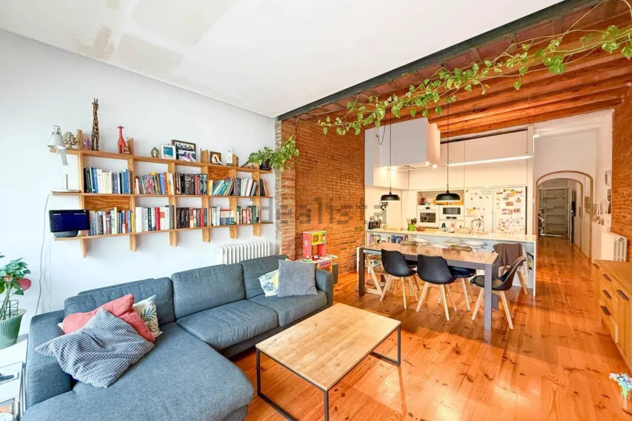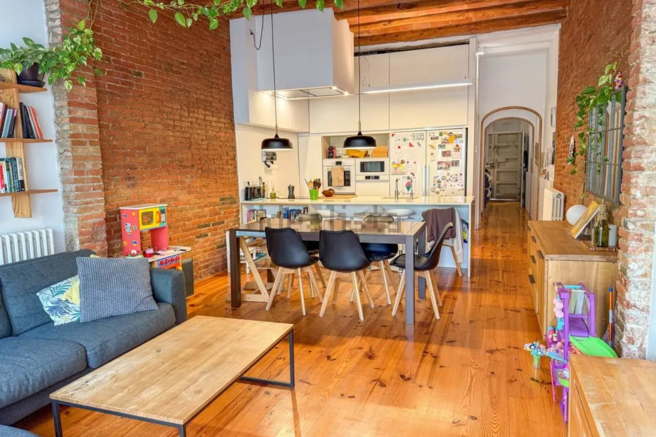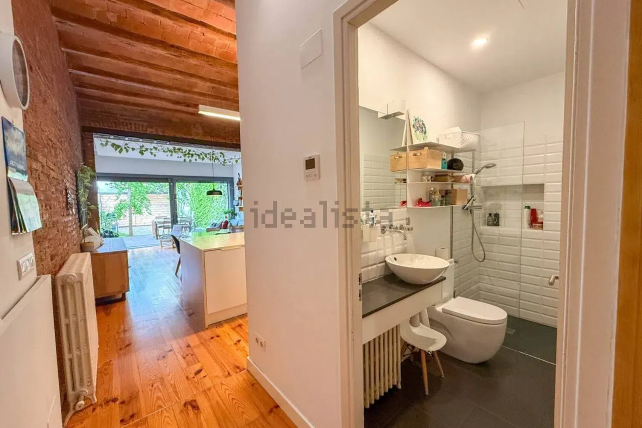 Desde el patio accedemos directamente al gran salón-comedor con cocina americana integrada, un espacio diáfano y luminoso que combina materiales cálidos como el parquet con paredes de obra vista y techos altos. En esta misma planta se ubica un baño completo, un despacho/estudio perfecto para trabajar desde casa, y el acceso directo a la calle.