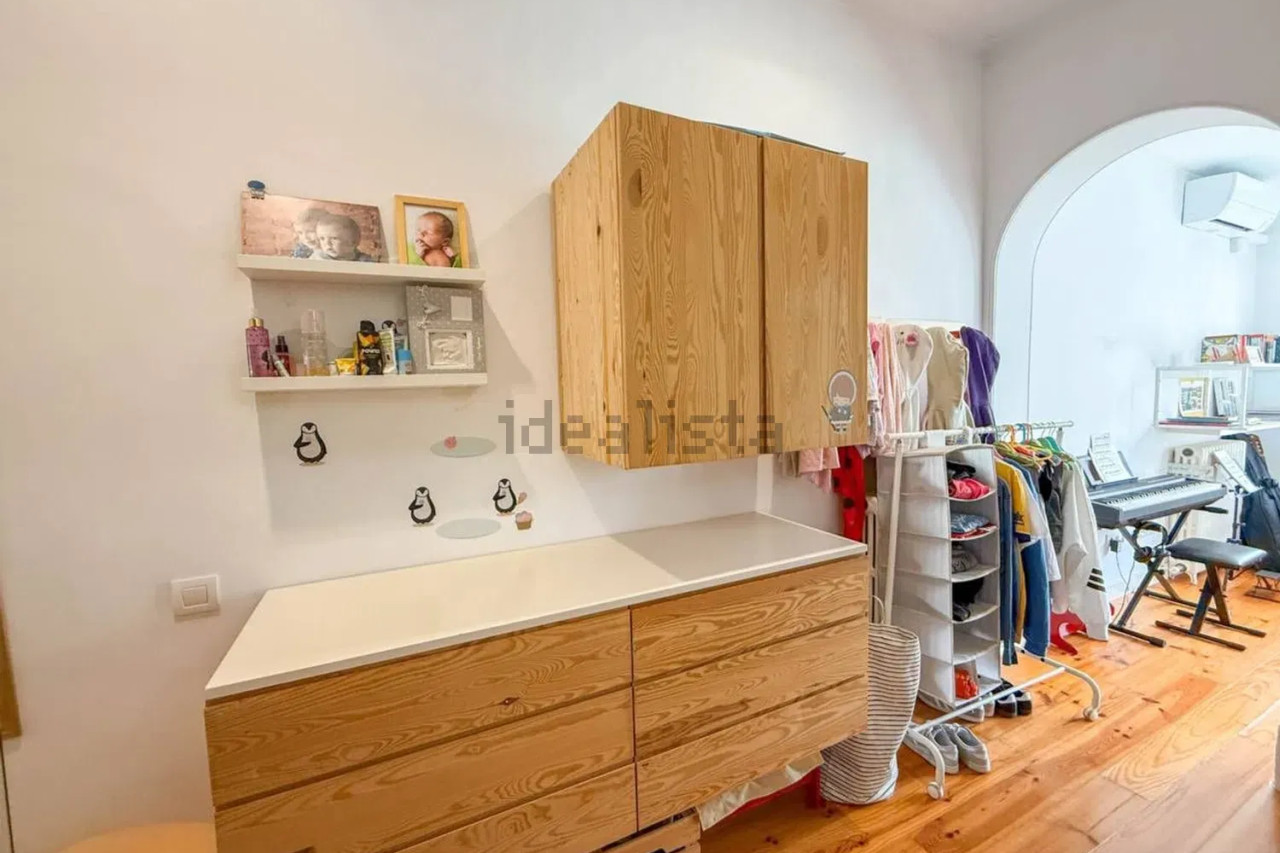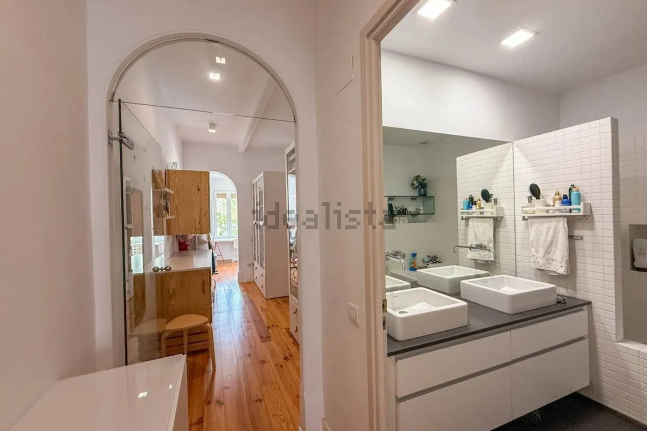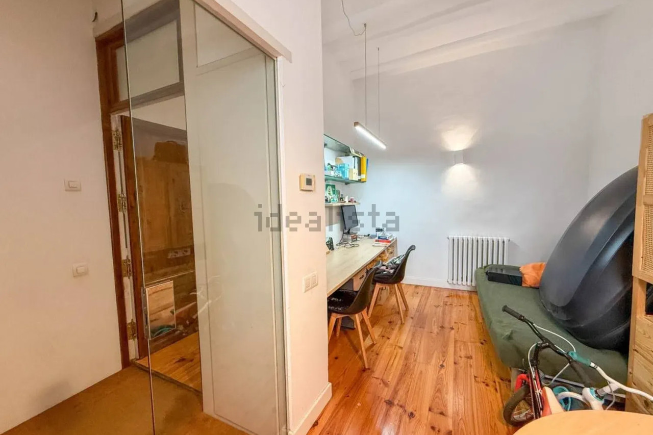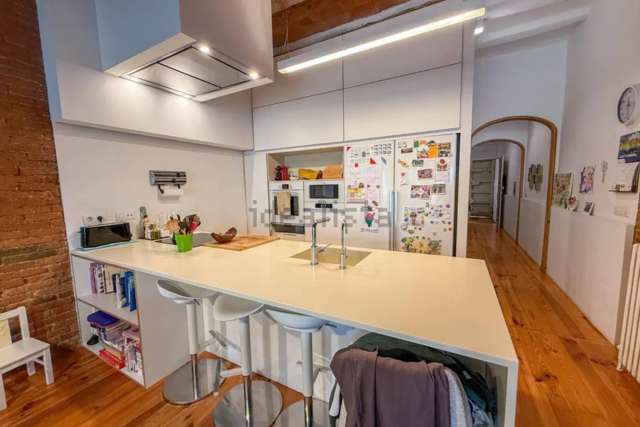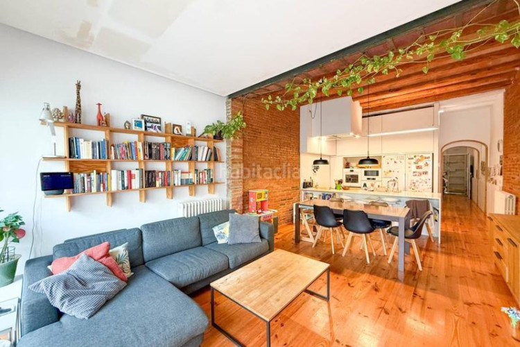 Desde el patio accedemos directamente al gran salón-comedor con cocina americana integrada, un espacio diáfano y luminoso que combina materiales cálidos como el parquet con paredes de obra vista y techos altos. En esta misma planta se ubica un baño completo, un despacho/estudio perfecto para trabajar desde casa, y el acceso directo a la calle.